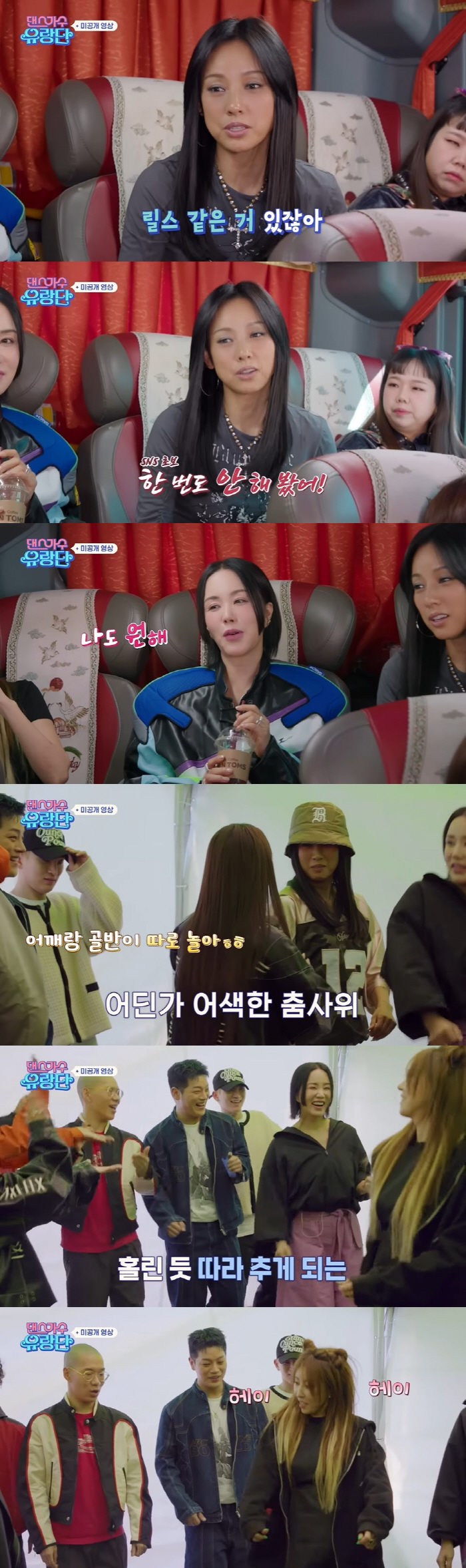 영상 속에는 공연을 위해 이동 중인 '댄스가수 유랑단' 멤버들의 모습이 담겼다. 그때 이효리는 "릴스 해보고 싶다. 다 같이 춤추는 거. 그런 거 한번도 안 해봤다"라고 하자, 엄정화는 "나도 그런 거(해보고 싶다)"고 했다.