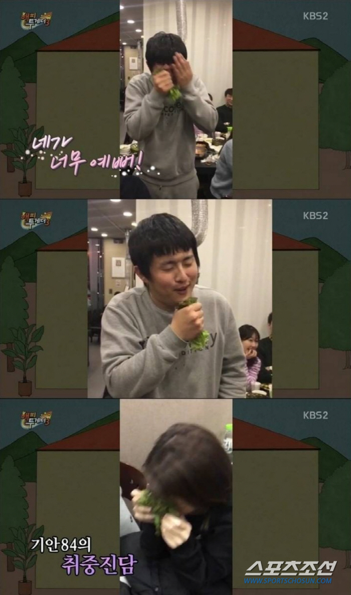 이어 이날 방송에서 유재석은 "박명수는 모를 텐데 기안84가 회식에서 엄현경에게 고백했다"라고 폭로했다. 이어지는 영상에서 기안84는 술에 취해 상추를 마이크인양 들고 엄현경에게 "네가 너무 예뻐"라고 외친 뒤 부끄러운듯 줄행랑을 쳤다. 이어지는 자막에 '상추 프러포즈' '이불킥 10년짜리 당첨'이라고 뜨면서 웃음을 더했다.