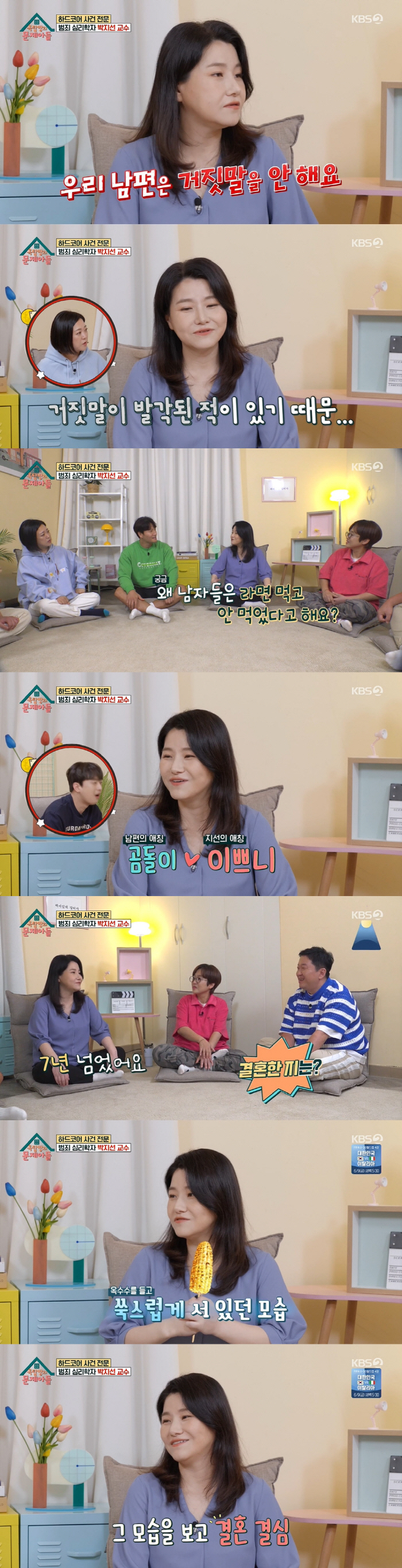박지선 교수는 "2년 정도 연애하고 결혼했다. 결혼한 지 7년 넘었다"면서 "저 모습이라면 평생 갈 수 있겠다 생각을 했다"면서 남편에서 반했던 순간을 떠올렸다. 그는 "놀이공원 데이트 중 '구운 옥수수 맛있겠다'고 하고 지나갔는데, 화장실에 갔다가 나왔더니 남편이 쑥스럽게 옥수수를 들고 서 있었다"며 결혼을 결심한 순간을 밝혔다.