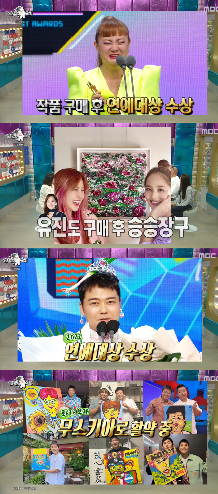 솔비는 "내 그림을 산 구매자들이 모두 다 잘되는 모습을 보면 뿌듯하다"며 "제 그림을 사고 바로 임신이 됐다던가, 좋은 일이 생기는 경우가 많았다"고 했다. 또 "연예인들도 다 잘됐다. 박나래 언니도 내 그림 사고 연예대상 받았고 전현무 오빠도 내 그림 구매 후 연예대상을 받았다. 유진 언니도 '펜트하우스'가 대박을 쳤다"고 말했다.