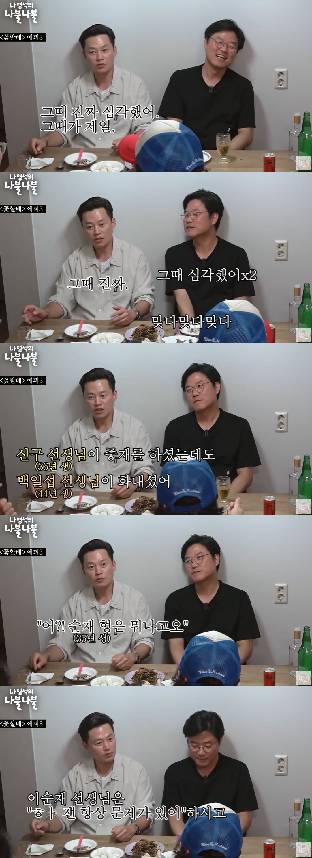 이어 이우정 작가가 "백일섭 선생님이 김치통 발로 찼을 때 있었냐"는 물었고 이서진은 "내가 주워 담았다"고 답했다. "진짜 화를 내신 거냐"는 물음에 나영석 PD는 "진짜다. 일섭 선생님은 단 한 번도 카메라 앞에서 거짓으로 하신 적이 없다. 그게 그분의 진짜 멋진 점이다"라고 말했다.