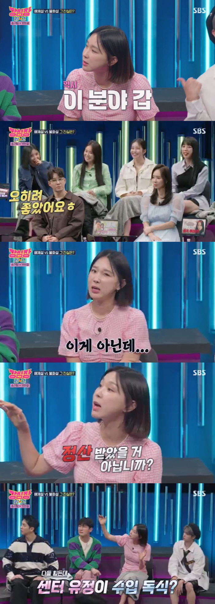 하지만 유나는 "스케줄 바쁠 때 유정 언니 혼자 일하러 갈 때도 있다. 그럼 저희는 오히려 좋았다"고 답했다. 원하는 답이 나오지 않자 이지헤는 "그럼 이렇게 물어보겠다. 정산 받았을 거 아니냐. 힘든 시기에 정산 받았는데 유정 씨가 조금 더 많이 가져갔냐"고 물었다.