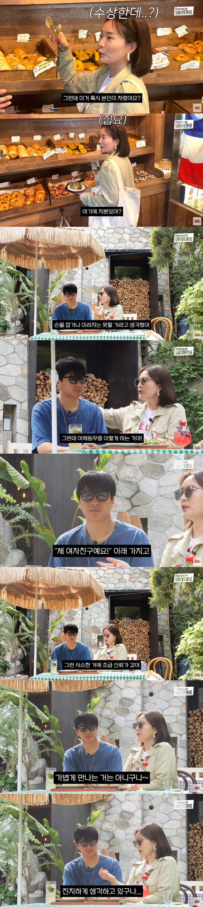 김승현은 베이글을 먹으며 장정윤과의 연애 시절 데이트 모습을 떠올렸다. 이에 장정윤은 "연애할 때 처음에 연예인이고 한창 '살림남'으로 잘 나고 있을 때니까 손을 잡거나 이러지는 못할 거라고 생각했다"면서 "그런데 선배가 딱 만났는데 어깨동무를 하더라. 그래서 이래도 되나 싶었다"고 떠올렸다.