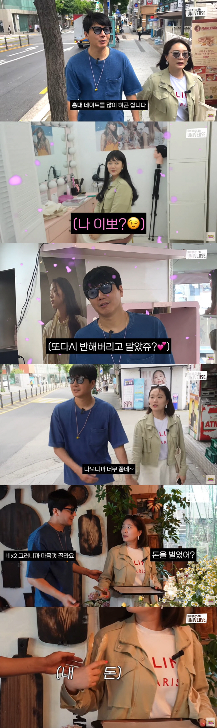 영상 속 김승현은 "연애 시절때도 홍대 자주 왔다"며 아내 장정윤 작가와 데이트를 즐겼다. 그때 김승현은 "장작가 좋아하는 가발집이다"고 했고, 두 사람은 함께 안으로 향했다. 이후 긴 생머리 가발을 착용한 아내의 모습을 본 김승현은 "완전 딴 사람 됐다"면서 "머리가 기니까 더 어려보인다"면서 아내의 모습에서 눈을 떼지 못했다.