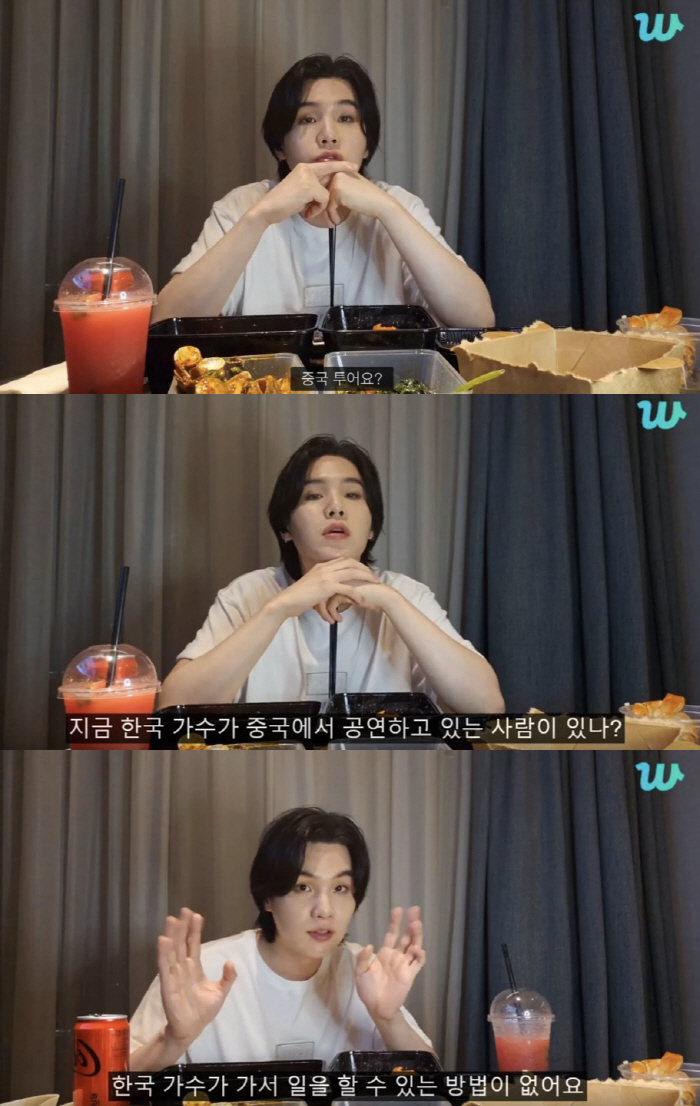 방탄소년단 슈가는 최근 팬 플랫폼 위버스에서 라이브 방송을 진행했다. 한 팬은 슈가에게 "중국 투어도 해달라"고 이야기했고 슈가는 "중국에서 공연할 수가 없는데 어떻게 중국 투어를 하지? 지금 한국 가수 중 중국에서 공연하는 사람이 있나? 없을 텐데"라고 밝혔다.