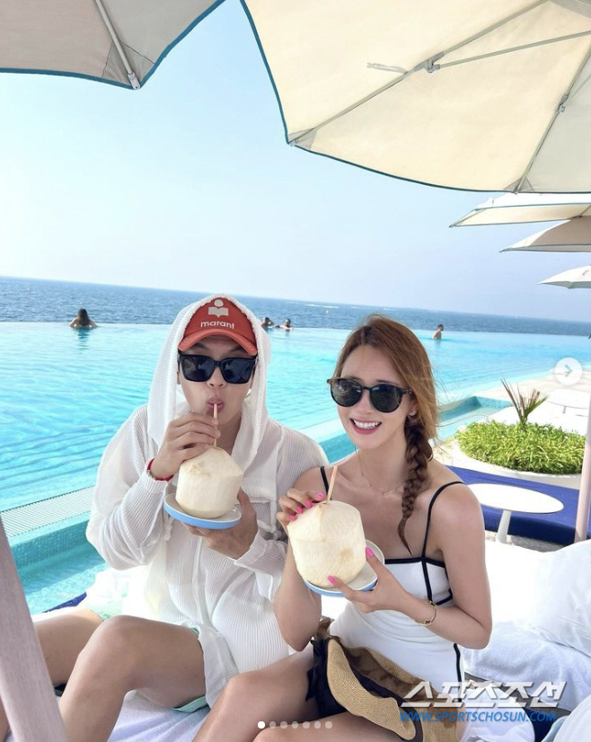 사진 속 이다해 세븐 부부는 오션뷰가 감탄을 부르는 호텔 수영장에서 이른 더위를 식히고 있다.