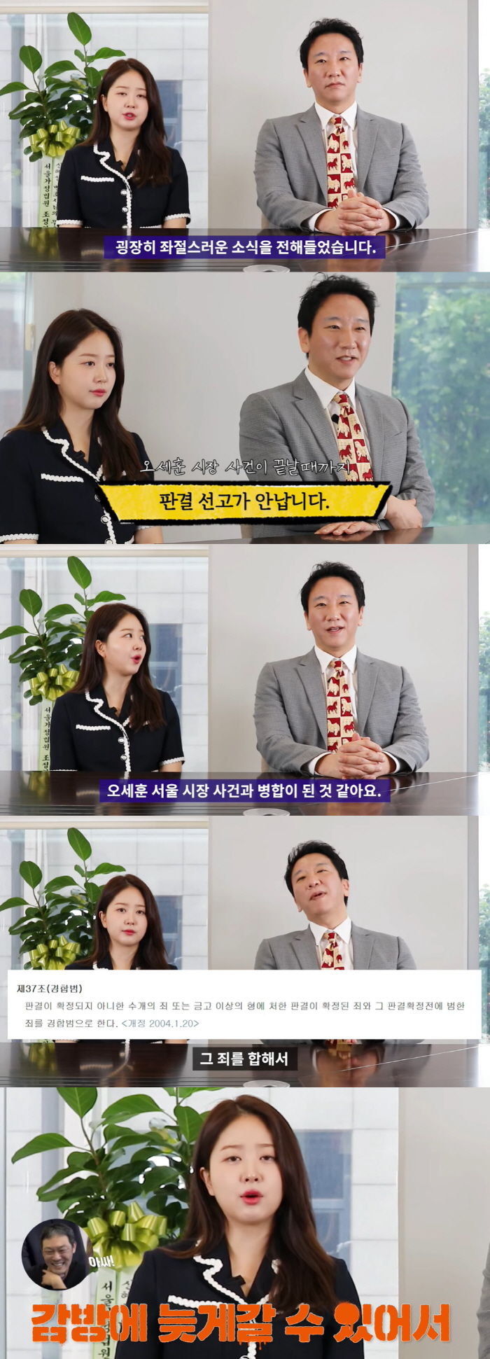 김다예는 "피해 당사자 입장에서 굉장히 좌절스러운 소식을 들었다. 저희 재판이 오세훈 서울시장 사건과 병합이 됐다"라고 알렸다. 노종언 변호사는 "이렇게 되면 다른 사건이 끝날 때까지 판결 선고가 안 난다"라며 답답해했다.