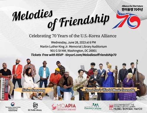 (워싱턴=연합뉴스) 김병수 특파원 = 주미한국대사관과 워싱턴DC는 한미동맹 70주년을 기념해 오는 28일 오후 6시(현지시간) 워싱턴DC 마틴 루서 킹 기념도서관 오디토리움에서 '우정의 멜로디' 합동 공연을 개최한다.