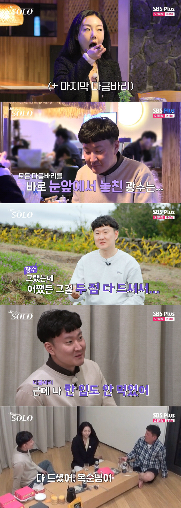 하지만 광수는 숙소에 돌아와 다른 멤버들이 있는 자리에서 "밀치랑 다금바리를 먹고 왔는데 다금바리는 한입도 안 먹었다. 말은 안 했지만 옥순 님이 다 드셨다. 모든 회가 두 점씩 명백하게 있었기 때문에 말을 한 거다"라며 티를 냈고 옥순은 "난 진짜 몰랐다"라며 사과했다. 광수는 "옥순님은 몰랐을 것 같았으니까 패스! 절대 중요한 거 아니다"라며 대화 방향을 바꿨다.