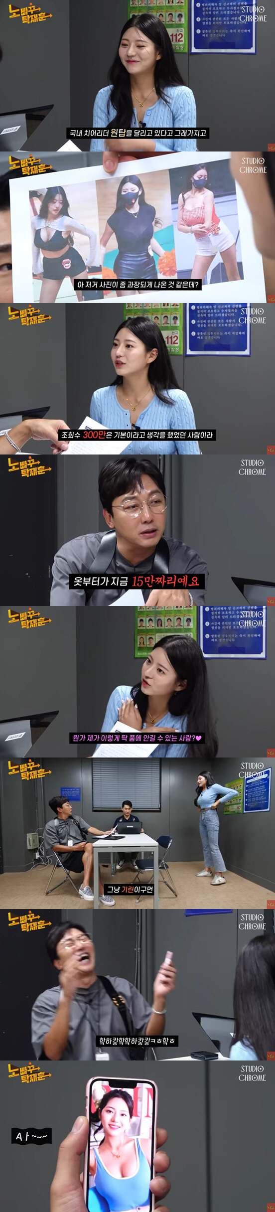 탁재훈은 "여기에 박기량, 이다혜 치어리더 나왔다"고 말했고, 김이서 치어리더는 "영상 봤다. 그 분들 나온 영상의 조회수를 뛰어넘을 수 있다고 생각했다. 저는 여기 나오면 조회수 300만은 기본이라고 생각을 했다"고 밝혔다. 이에 탁재훈은 단정하게 니트 카디건을 입은 김이서 치어리더를 향해 "옷 부터가 조회수 15만짜리다"라고 지적해 폭소를 자아냈다.