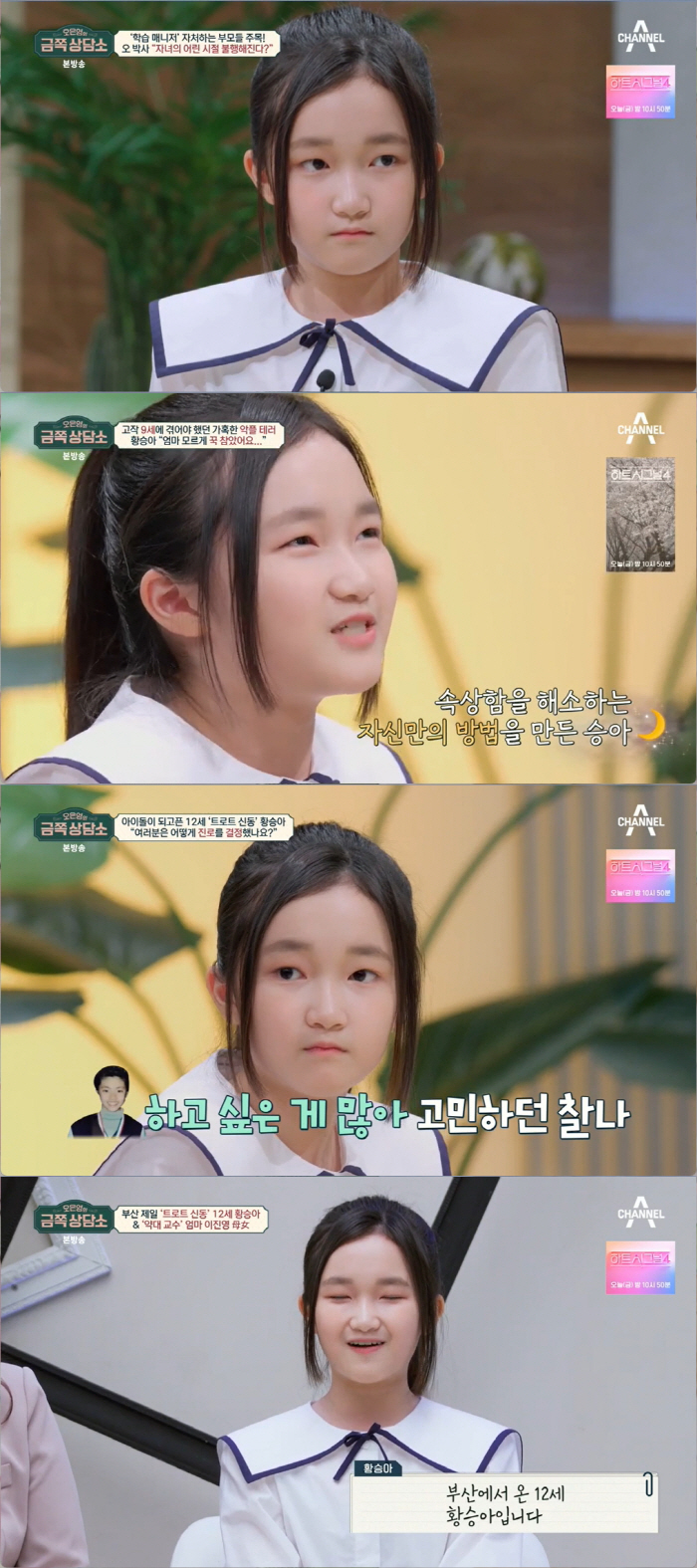 황승아는 '가장 행복한 순간'에 "새로운 노래를 녹음하거나 노래를 부르고 왔을 때 부모님이 '오늘 너무 잘했어' 할 때 보람이 있구나 싶다. 주변 사람들한테 인정 받을 때가 가장 뿌듯하다"라 털어놓았다. 오은영 박사는 "승아야 열두 살은 지금 뿐이야"라면서 앞으로는 열두살 답게 살 수 있게 조언했다.