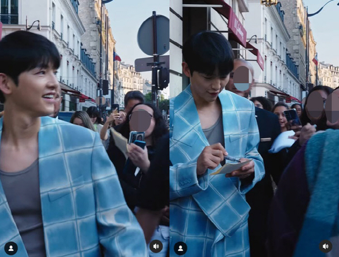 공개된 영상에는 송중기가 프랑스 파리 퐁네프 다리에서 열린 퍼렐 윌리엄스의 첫 쇼, 루이비통 2024 S/S 맨즈 컬렉션에 참석하는 모습이 담겨있다. 설렘 가득한 표정으로 쇼장으로 향한 송중기는 거리에서 마주친 해외 팬들에게 미소를 날리고 사인을 해주는 등 친절하고 스윗한 팬서비스를 선보여 눈길을 끈다. 체크 패턴의 오버핏 수트를 입은 송중기는 최근 아빠가 됐음에도 여전히 미소년같은 훈훈한 외모를 뽐내 감탄을 자아낸다.