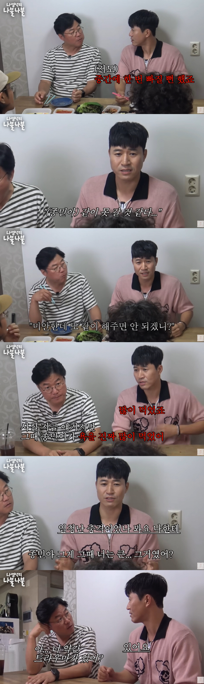 또 김종민은 "난 시즌 1 때 적응한 적이 없다"고 밝혀 나영석 PD를 충격받게 했다. 나영석 PD는 적응하지 못했지만 그냥 참고 노력했다는 김종민의 말에 "너한테 진짜 미안하다. 그 정도일 거라고 생각 못 했다. 1년 정도 걸려서 적응했을 거라고 난 그냥 생각했다"며 "아까 네가 '그때 멤버들 다시 만나면 트라우마 생길 거 같다'고 한 말을 이제 알겠다"며 진심으로 미안해했다. 이에 김종민은 "오히려 몰라주는 게 더 좋다. 알았으면 또 자꾸 안쓰러운 거로 봤을 거 아니냐"며 "내가 제일 고마웠던 건 형들이 힘든 시기 때 그래도 날 내치지 않고 잘 참아준 게 고마웠다"며 웃었다.