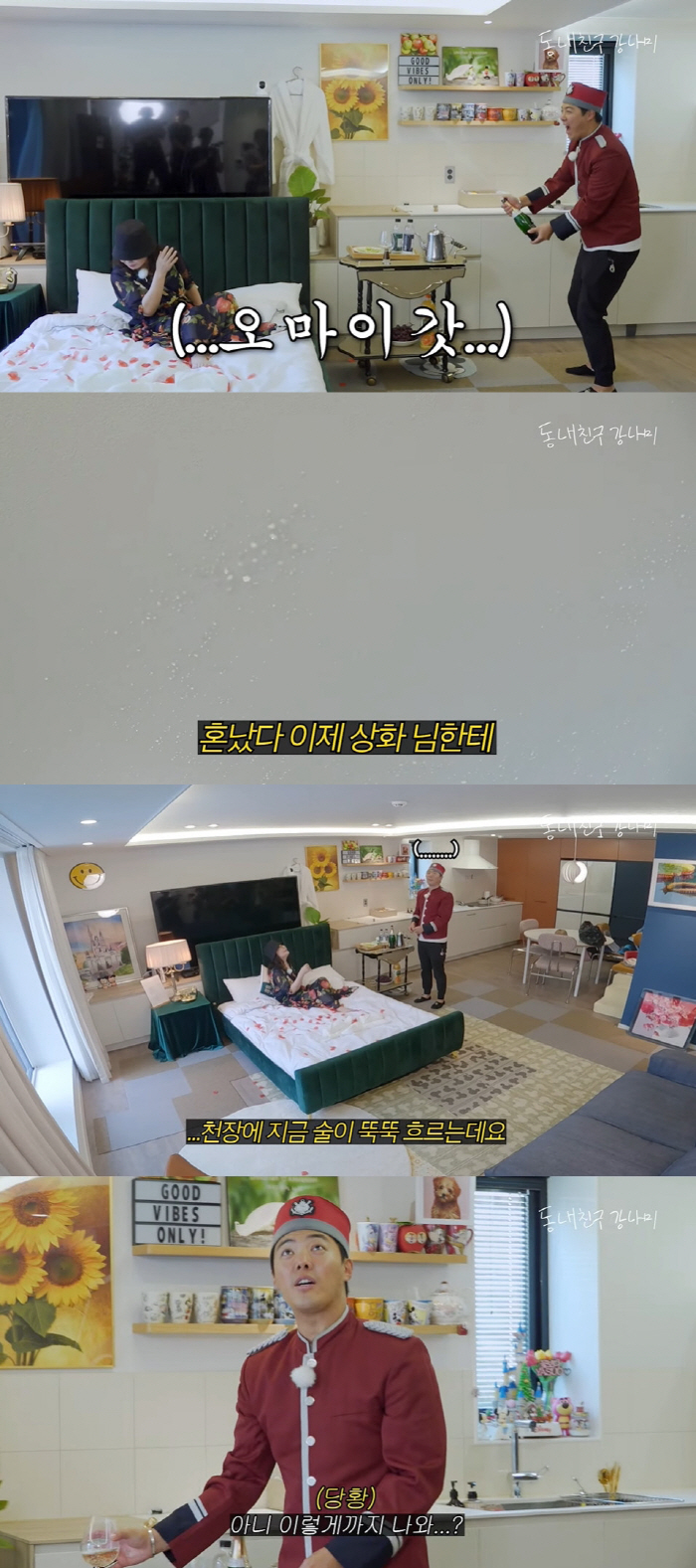 잔뜩 화가난 채 집으로 들어선 어머는 "아 짜증난다. 이 옷이 좀 불쌍하지 않나"고 해 웃음을 안겼다. 그때 강남은 웰컴 드링크로 샴페인을 터트렸고, "천장에서술이 뚝뚝 흐른다. 이제 상화님한테 혼났다"는 말에 "샴페인이 이렇게 까지 나오냐"며 당황했다. 이어 풀장까지 준비했지만, 어머니는 "다 마음에 안 든다"고 해 웃음을 자아냈다. 이어 강남은 룸서비스로 해물 라면과 디저트를 준비, 어머니는 "맛있다. 여기는 음식은 좀 하는 것 같다"며 인정했다.