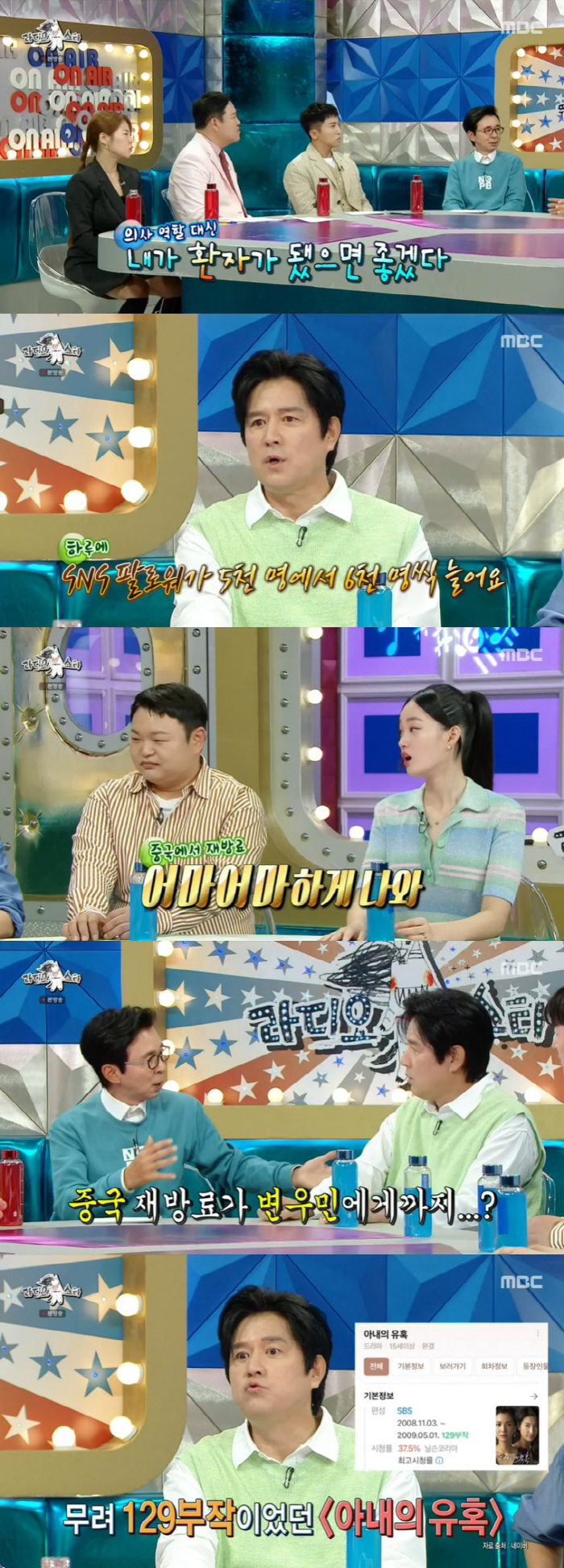 변우민은 SBS '아내의 유혹' 방영 당시 중국에서도 큰 인기를 끌었다. '아내의 유혹'은 아직까지 중국에서 재방송이 되고 있다며 "재방료가 어마어마하게 나온다. 나 거기서 주인공이었다. 그게 129회인가 그렇다"고 자랑해 모두를 놀라게 했다.