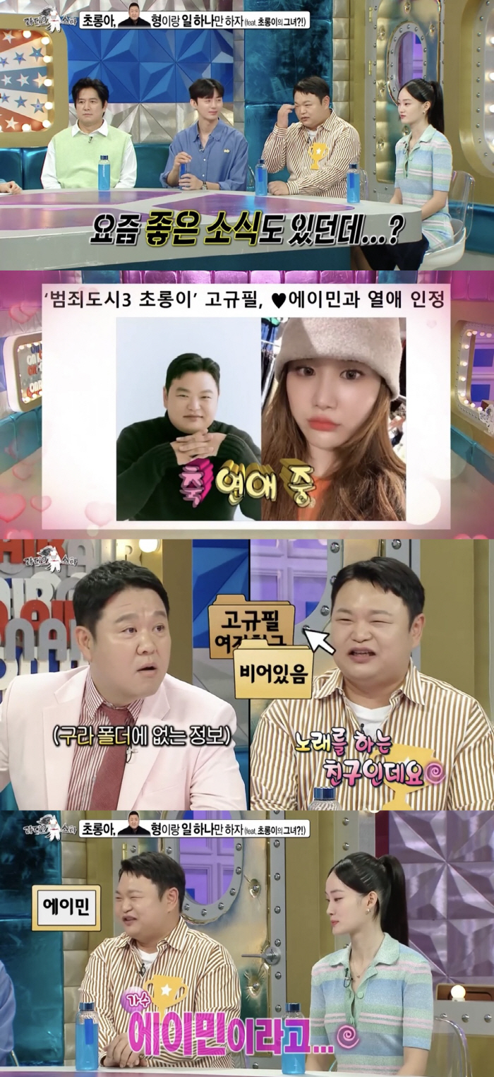 이어 고규필은 MC들이 "요즘 또 좋은 소식이 있지 않나. 열애설이 났다"고 하자, "노래하는 친구고 에이민이라고 한다. 사실 열애 기사가 날 줄은 꿈에도 몰랐다. 알고 지내고 사귄 기간은 9년인데, 꽉 채운 9년은 아니다. 그 기간에 이별도 있었고 왔다 갔다 했다"고 말했다.