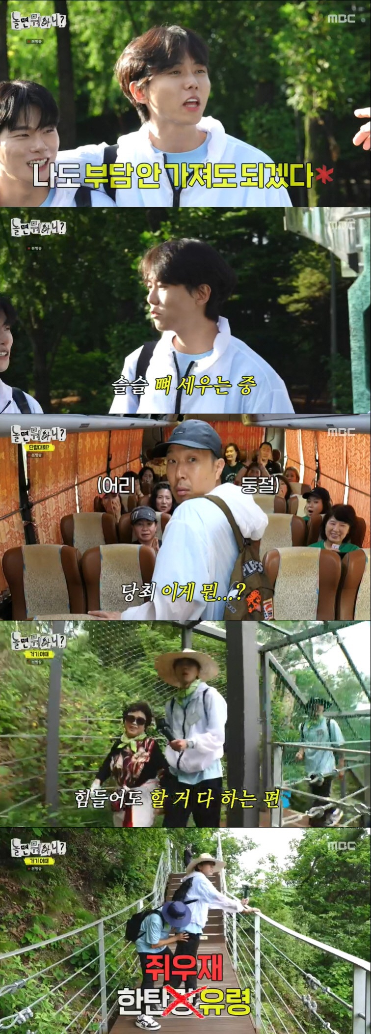 한탄강 주상절리길에 도착한 유재석 이이경 주우재. 쌩슌한 줌바 회원들과 달리 주우재는 몸도 제대로 가누지 못했고 엉덩이에 쥐까지 났다.