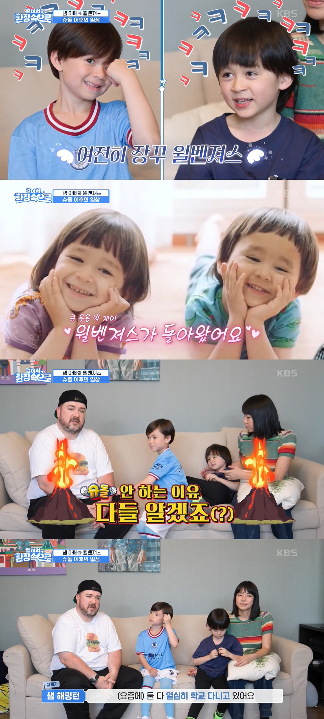윌리엄은 "안녕하세요. 저는 윌리엄입니다"라고 소개한 후 "12살, 아니 50살 입니다"라고 나이를 설명하며 장난을 쳤다. 벤틀리 역시 "안녕하세요 벤틀리입니다. 나는 다섯살이에요"라며 형을 따라하며 장난을 쳐 웃음을 안겼다. 실제 윌리엄과 벤틀리는 각각 8살, 7살이 됐다고.