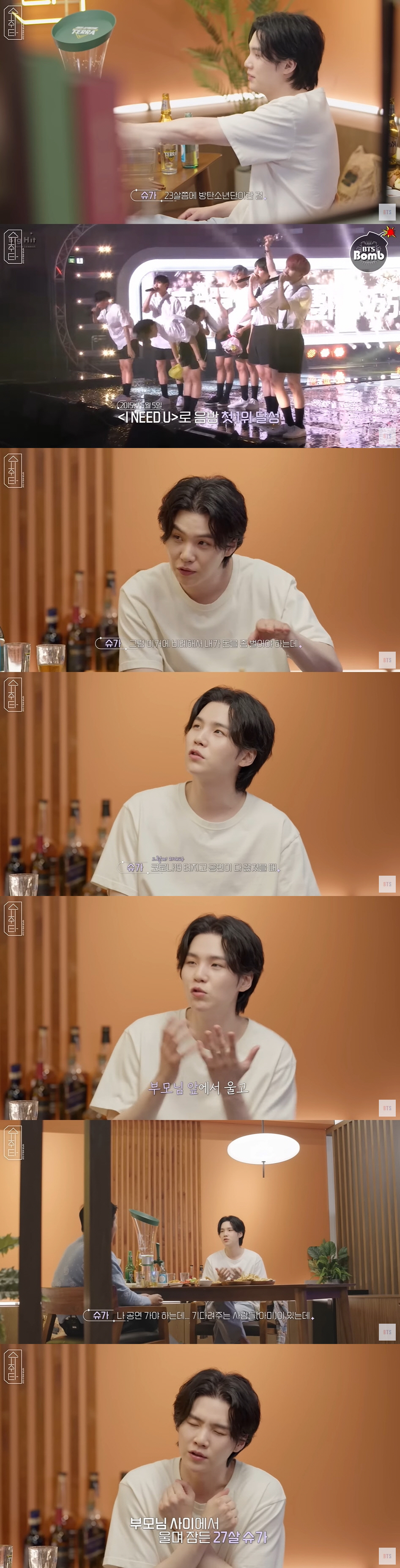 이어 슈가는 "17살 때부터 일을 시작했다. 21살에 데뷔하고 23살 쯤 방탄소년단이란 걸 사람들이 인지하기 시작했다"면서 "제가 제일 괴로웠던 순간은 23살 때다. 사람들은 나를 좀 아는데, 그럼 이거에 비례해서 내가 돈을 좀 벌어야 하는데 계속 마이너스였다"고 털어놨다. 그는 "다만 가족들한테는 항상 '나 괜찮다. 잘되고 있다'를 보여줘야 하니까, 코로나19 터지고 공연이 다 끊겼을 때 그때 처음으로 부모님께 약한 모습을 보여준 것 같다. 울고 그랬다"고 솔직하게 밝혔다. 슈가는 "'공연 가야 하는데, 기다려주는 사람들이 있는데 왜 못가고 있지?'라면서 울었다. 부모님 사이에서 잤다"며 "18살 때부터 집을 떠나서 살았는데 그때가 27살이었다. 엄청 울면서 괴로워하면서 부모님 사이에서 잤다"고 털어놨다.