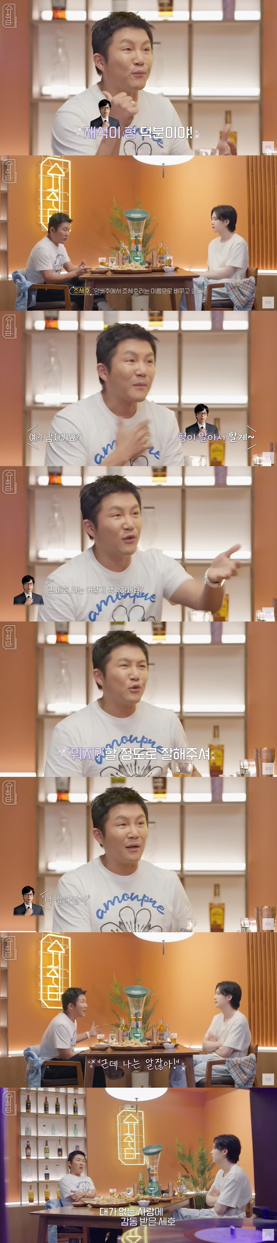 이어 조세호는 "내가 조세호라는 이름을 잘 알리게 된 계기가 재석이 형 덕분이다"며 고마운 마음을 전했다. 그는 "'놀러와' 패널 일 때, 재석이 형한테 '양배추에서 조세호라는 이름으로 바꾸고 싶다. 언제부터 쓸 수 있을까요?'라고 했더니 '오늘 녹화부터 하자. 내가 알아서 할게'라고 하셨다"면서 "녹화 중 나를 조세호로 불러주셨다. 그러면 내가 '저 구 양배추 현 조세호다'고 해서 시작이 된거다"고 했다. 슈가는 "재석이 형은 특히나 더 후배들을 많이 챙기려고 하시는 분이지 않냐"고 했다.