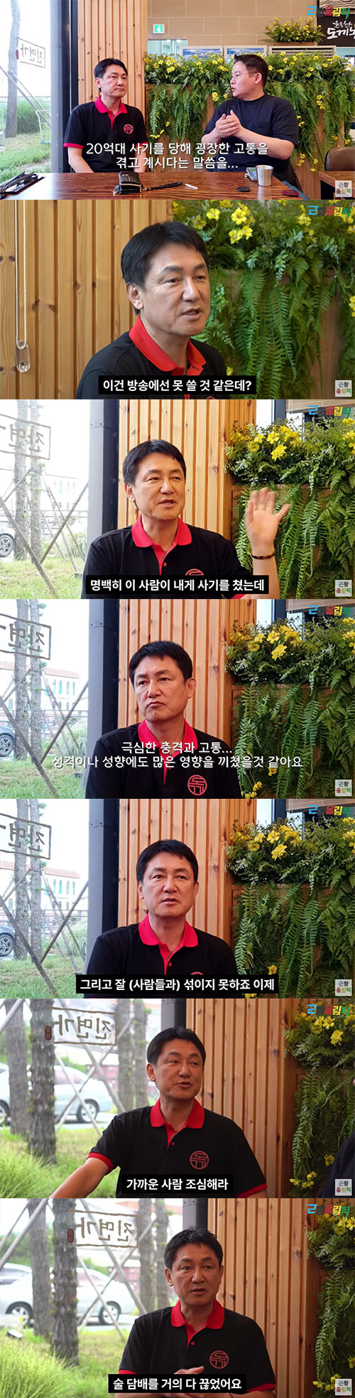 영상서 윤용현은 "20억대 사기를 당했다던데"라는 질문에 "오래된 고향 형님이었다. 의형제를 맺을 정도였다. 콩을 가리키며 '이건 된장이야' 해도 믿을 정도로 믿고 따르던 형님이었다. 저를 힘들게 하고 그 형님은 지금 페라리 타고 다닌다더라. 제가 타보고 싶었던 차였는데 하나도 안 부럽다. 누군가의 피눈물이니까"라고 전했다.