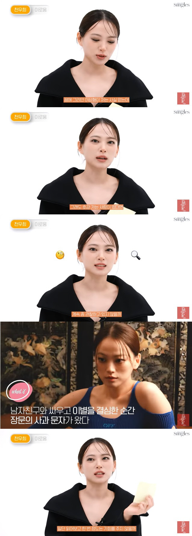 남자친구와 싸우고 이별을 결심한 순간 장문의 사과 문자가 왔다는 상황에 대해서는 "문자 읽어보고 한 번 정도는 기회를 주지 않을까"라며 "문자가 오더라도 만나서 얘기하지 왜 문자로 하냐고 할 거 같긴 한데 한 번 정도는 다시 생각해볼 거 같다"고 밝혔다.
