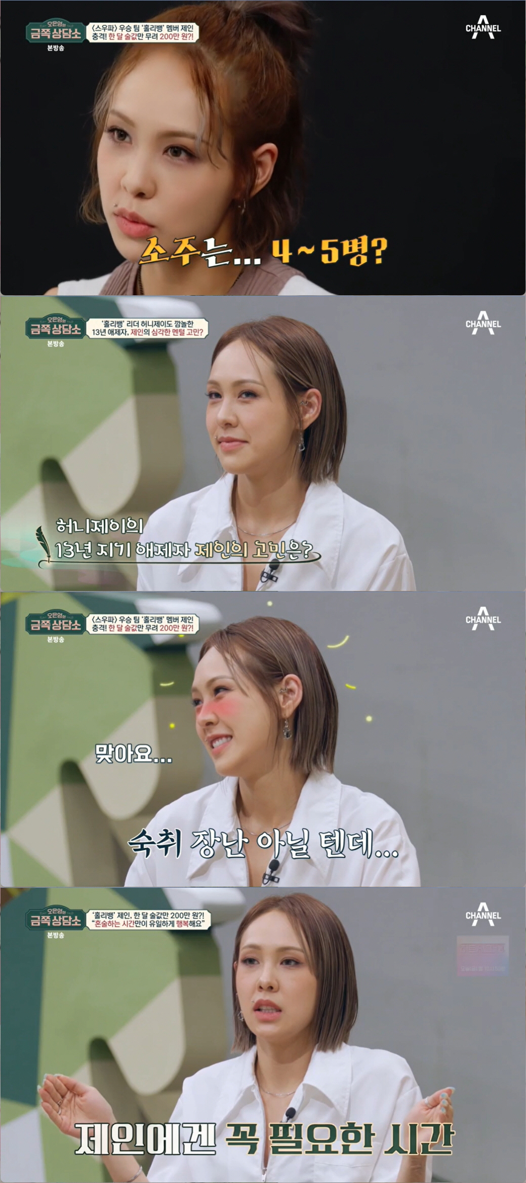 제인은 "술은 거의 매일 마신다. 말리는 사람이 없으면 한 달 술값만 200만 원이 든다. 맥주는 배만 안부르면 무한대로 마시고 소주는 4~5병을 마신다. 돈이 부족하면 싸고 독한 술을 마셨다. 스트레스인게 '나는 왜 술 제어가 안될까'였다. '소주 2병만 마셔야지' 하는데 마시다 기분이 좋아지면 집의 온갖 술은 다 꺼내 마신다. 술 안마시려고 버티다 새벽 6시에 술을 사러 나간 적도 있다"라며 고민을 털어놓았다.