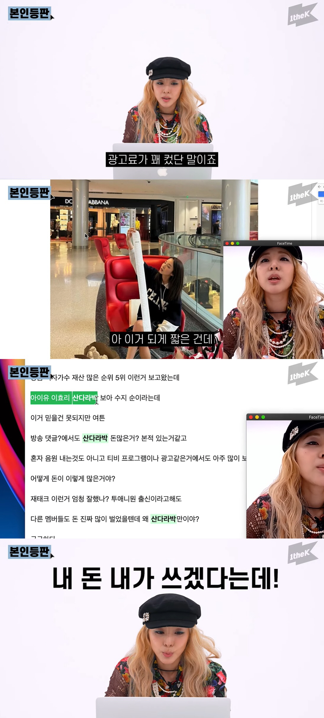 누리꾼의 궁금증을 들어보는 시간도 가졌다. 산다라박은 "산다라박 재산 왜 이렇게 많은 거야? 여자 가수 재산 많은 순위 5위까지 봤는데 어떻게 돈이 이렇게 많은 거야. 재테크를 잘한 건가"라는 누리꾼의 글을 본 후 "해체 후 이런 얘기가 많았다. 어디에서 돈을 벌어 쇼핑을 하냐고 하더라. 화날 뻔했다. 국내에서는 많이 없었지만 해외에서는 광고를 많이 찍었다. 광고료가 꽤 컸다. 꾸준히 잘 벌고 있었는데 무시해서 욱했다. 재테크는 못했고 저금도 안 한다"라고 밝혔다.