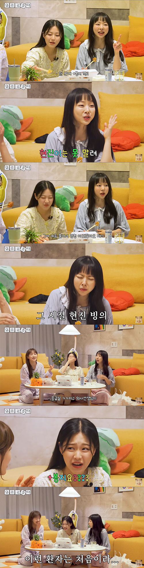 또 츄와 현진 비비는 치킨 먹방을 이어가다 "옛날에 현진이 다이어트 할 때 곤약면을 한 번에 4봉지 먹고 병원에 갔다. 그게 계속 불어서 배가 엄청 아프지 않았냐"라고 다이어트 당시 현진의 사고를 언급했다.