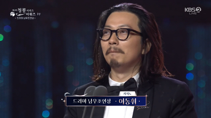 이날 드라마 부문 남우조연상은 디즈니+ 오리지널 시리즈 '카지노'에서 차무식(최민식)의 의동생이자 오른팔 양정팔 역을 연기한 이동휘가 차지했다. '카지노'는 우여곡절 끝에 카지노의 왕이 된 한 남자가 일련의 사건으로 모든 것을 잃은 후 생존과 목숨을 걸고 게임에 복귀하는 강렬한 이야기를 그린 작품이다.