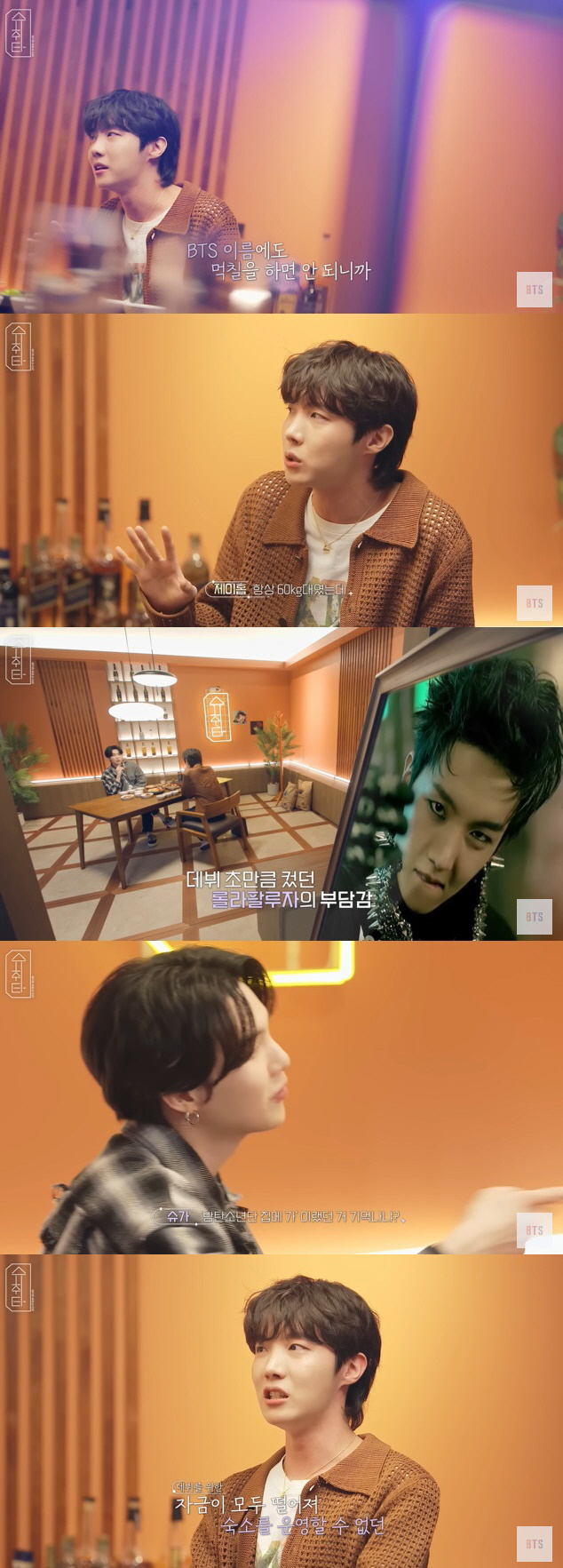 제이홉은 "열심히 했다. BTS 팀에 먹칠을 하면 안 되니까"라고 말했고 슈가는 "먹칠할 사람이면 네가 거기 갔겠냐"고 슈가를 치켜세웠다. 슈가는 "연습하면서 살 빠지는 거 보니까 살벌하게 빠지더라"라고 말했고 제이홉은 "처음으로 그때가 50kg대였다. 항상 60kg대였는데 50kg대는 데뷔 초"라고 밝혀 슈가를 놀라게 했다.