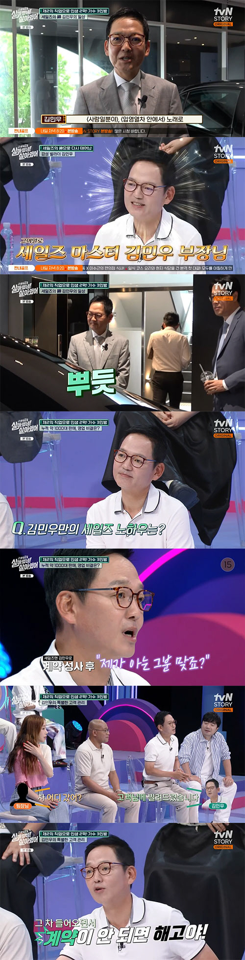 김민우는 "처음 영업할 때 허참 선생님이 시상하는 곳에 가 '축하 의미로 시승차를 가져왔다'라고 이야기했다. 팀장은 '시승차 어디있냐'라고 물어봐서 '고객님에게 드리고 왔다'라고 말했다. 이에 팀장은 '계약이 안 되면 너도 나가라'라고 했는데 허참 선생님이 오셨는데 차 안에 의상이랑 신발들이 들어 있었고 마음에 드셔하셨고 계약을 하셨다"라고 비하인드를 전했다.
