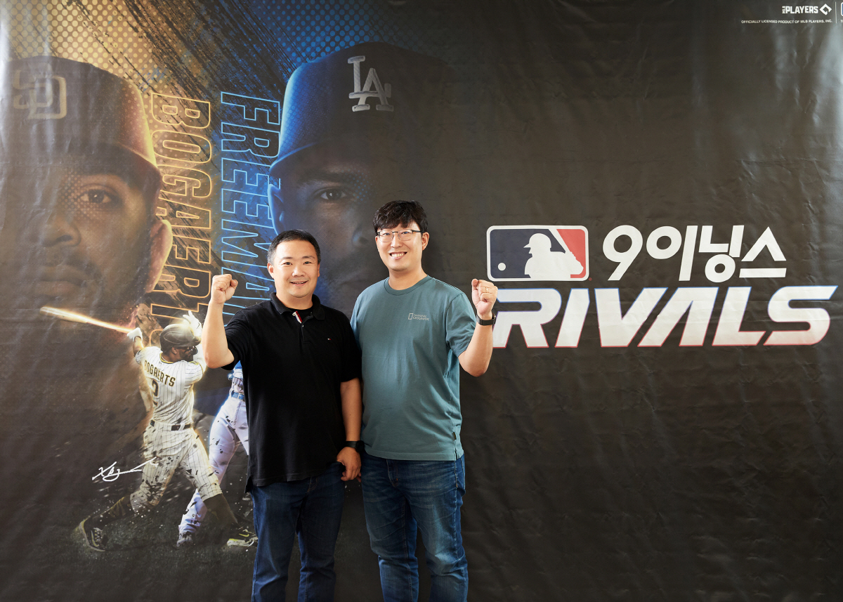 'MLB 9이닝스 라이벌'을 개발하고 서비스 하고 있는 컴투스 홍지웅 제작 총괄 본부장(오른쪽)과 김정호 사업실장. 사진제공=컴투스