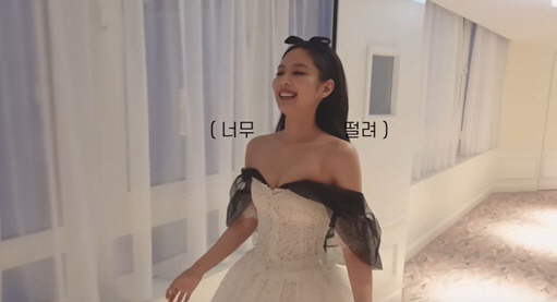 레드카펫에 서기 위해 제니는 새하얀 오프숄더 쉬폰 드레스에 검은 리본 머리장식을 했다. 딱 제니다운 러블리한 모습이었다. 레드카펫으로 향하며 제니는 "너무 떨린다. 오늘의 콘셉트는 어쩌다보니 백설공주가 됐다"며 무척 긴장한 모습을 보였다.
