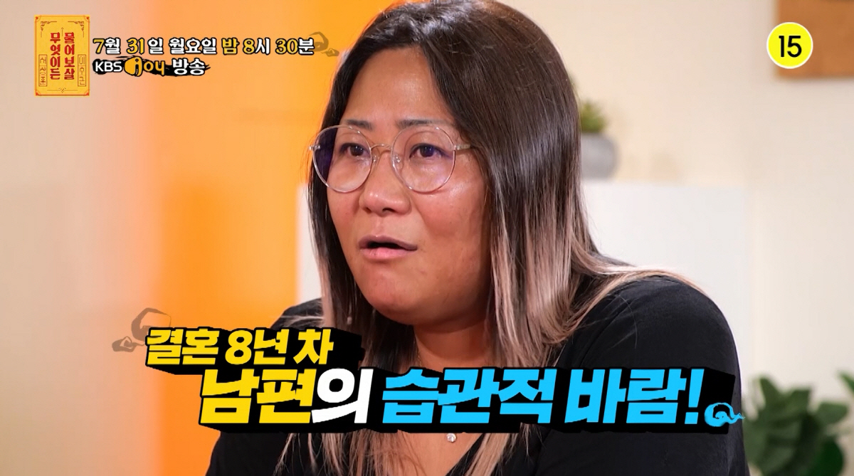 31일 방송하는 KBS Joy '무엇이든 물어보살'에는 결혼 8년 차 남편의 습관성 바람으로 인해 정신적 피해는 물론 자궁 탈장 수술과 당뇨병 진단 등 육체적 피해로 본인의 삶이 무너졌다는 사연자가 등장해 서장훈·이수근 두 보살을 안타깝게 했다.