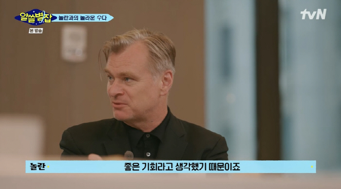 이날 MC 장항준은 CG를 거의 쓰지 않는 것으로 유명한 크리스토퍼 놀란에게 필름과 아날로그를 고집하는 이유에 대해 물었다. 이어 "스태프들은 불평하지 않냐"며 특유의 재치 있는 입담을 뽐냈다. 이에 크리스토퍼 놀란은 "CG를 지양하는 이유는 필름과 관련이 있다. 필름을 고집하는 이유는 필름의 화질과 질감이 눈에 보이는 것과 비슷하게 세상을 포착하기 때문이다. 관객이 영화를 통해 현실의 감각을 느끼길 바란다"며 "이걸 시각 효과에 적용하면서 최대한 실제로 찍으려고 한다. 그래픽보다 더 공감되고 실제로 위협적이고 무게감이 있기 때문이다"라고 답했다. 그러면서 "스태프들은 내 생각에는 도전을 즐긴다고 생각한다. 내가 던지는 모든 도전을 즐기는 것 같아. 아마 날씨 빼고. 내가 비, 폭풍, 바람 속에서 촬영하는 걸 좋아한다. CG로 하기보다는 실제로 찍는 거다. 그건 스태프들도 좋아하지 않는다"며 웃었다.