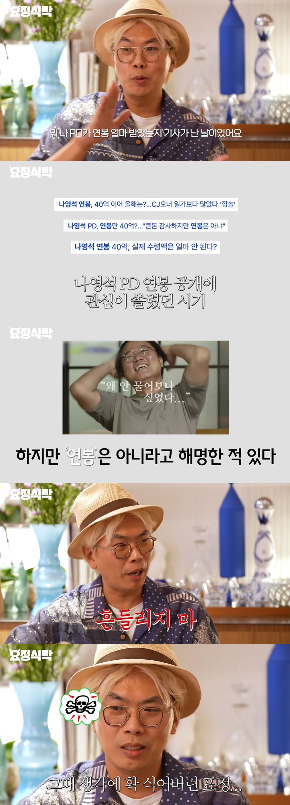 그러면서 "한 번은 나영석 PD가 연봉 얼마 받았는지 기사가 난 날이었다. 그날 딱 기사를 보고 MBC 출근하는데 갑자기 부사장실에서 '너 이따가 회사 오면 잠깐 들려라'라는 전화가 왔다. 그런 상황이면 되게 자꾸 상상하게 되지 않나. 택시를 타고 가는데 상암동 가는 시간이 너무 길게 느껴졌다. 딱 갔는데 이런저런 얘기 하시다가 '기사 봤니?' 해서 기사 봤다고 하고 답을 기다리고 있었다. 한참 정적이 흐르다가 '흔들리지 마'라고 하시더라. 제가 불만을 제기한 적도 없었는데"라고 털어놔 폭소를 자아냈다.