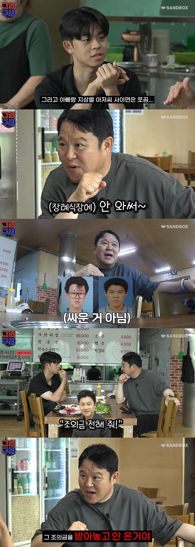 그리는 "괜히 미안한 게 아니라 미안한 거지"라고 말했고 김구라는 "지금 전화를 했는데 전화를 안 받는다. 일부러 안 받는 건 아니고"라고 토로했다. 그리는 "안 받지. 진중한 자리에서 그런 얘기를 하니까 더 그렇게 되지"라고 말했고 김구라는 "상렬이 얘기 이런 것도 좋은 얘기만 안 하려고 한다"고 밝혔다. 이어 제작진은 자막을 통해 '두 분 사이는 좋다'고 덧붙였다