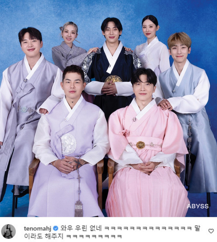 사진에는 박원, 산다라박, 멜로망스, 선미, 뱀뱀, 적재 등이 한복을 곱게 차려입고 포즈를 취하고 있는 모습이 담겼다. 어비스컴퍼니에 소속된 연예인 중 어반자카파를 제외한 모든 연예인들이 추석을 맞아 기념사진을 촬영한 것.