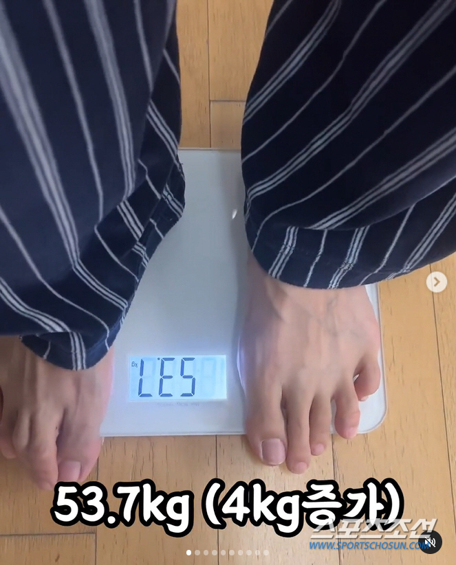 공개된 사진에서 미자는 53.7kg이 찍힌 체중계를 공개했다.