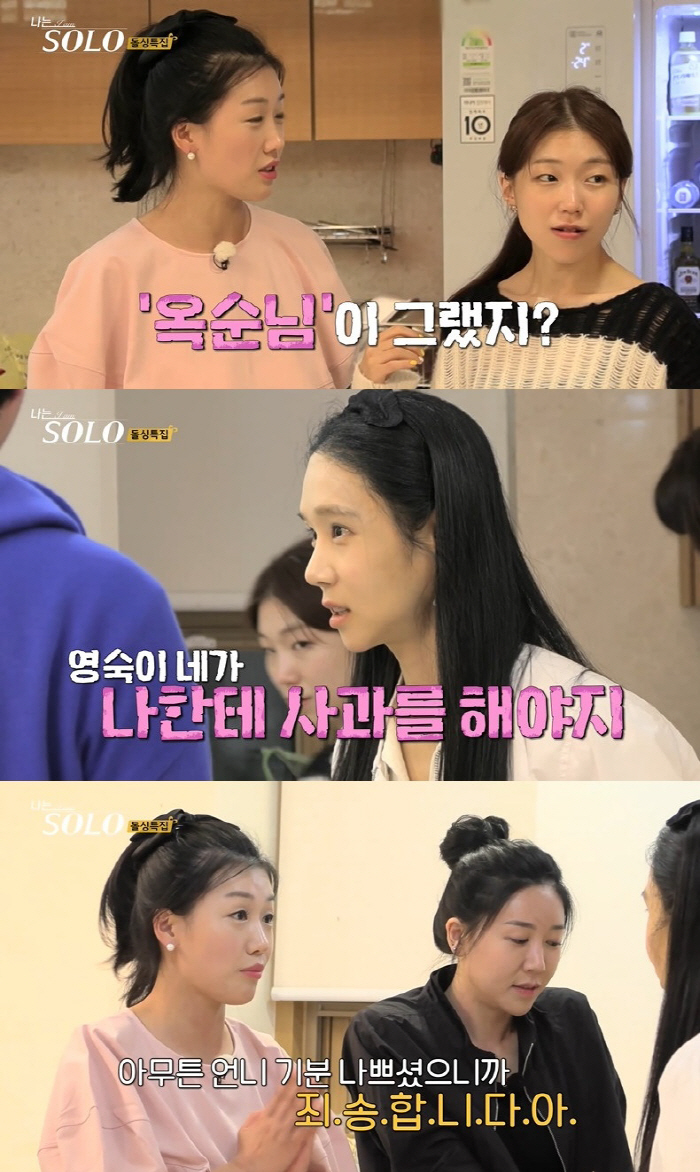 영숙은 "저랑 옥순 언니가 되게 사이가 돈독하고 괜찮았다. 근데 왜 그렇게 됐는지 모르겠다. 또 제가 메시지 보낸 것도 올라오고 해서 그냥 만나서 얘기하고 풀면 되는 거라 기대했는데 안 오셨더라. 그 부분이 조금 아쉽다"고 밝혔고 순자는 순간 웃음을 터뜨렸다. 이에 영숙은 "왜요? 왜 그렇게 웃어요?"라고 물었고 순식간에 분위기는 싸해졌다.