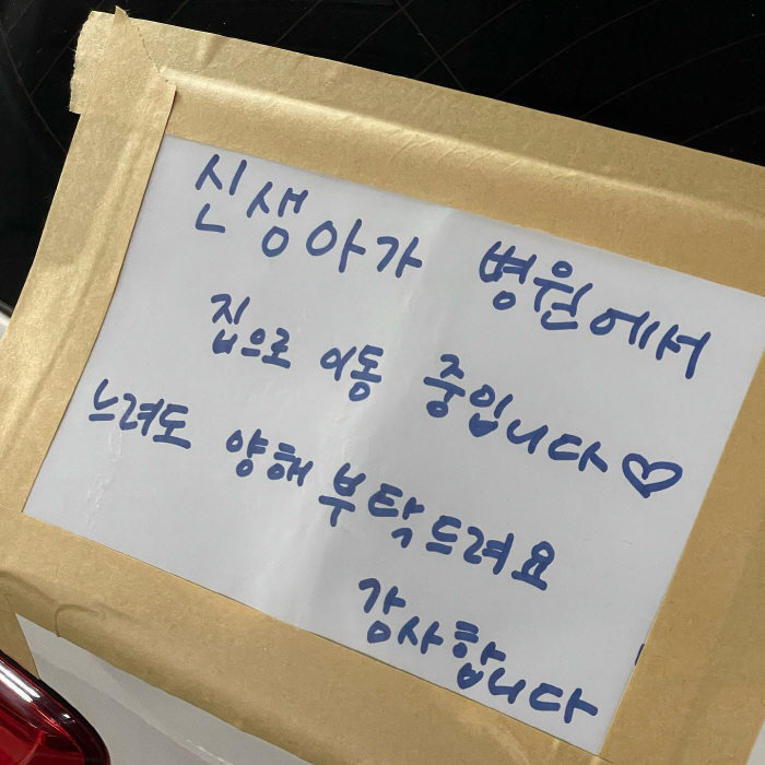 또 그는 아이를 데리고 집으로 돌아갈 때 차량 뒷면에 "신생아가 병원에서 집으로 이동 중입니다♡ 느려도 양해 부탁드려요. 감사합니다"라는 문구를 차량에 붙여 눈길을 끌었다.