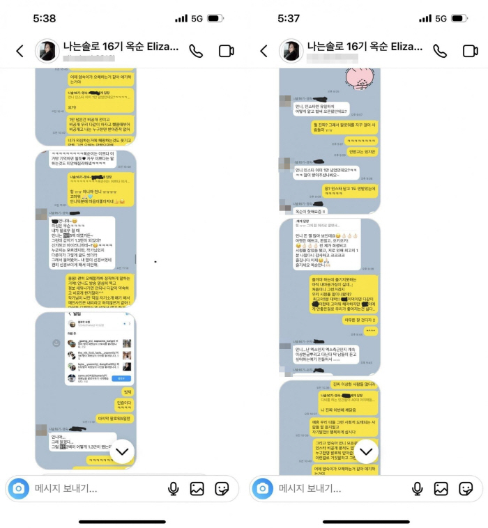 10일 온라인 커뮤니티에는 '나는 솔로' 16기 옥순이 DM(다이렉트 메시지)을 통해 공개한 듯한 단체 대화방의 내용이 퍼졌다. 영숙은 옥순의 팔로워 증가를 의심하며 "언니 계정만 유일하게 오픈됐다. 이미(팔로워) 1만 명을 넘었다. 많이 받아주셨나 보다"라고 했고, 옥순은 "계정을 닫고 한 명도 받지 않았다"고 밝혔다.
