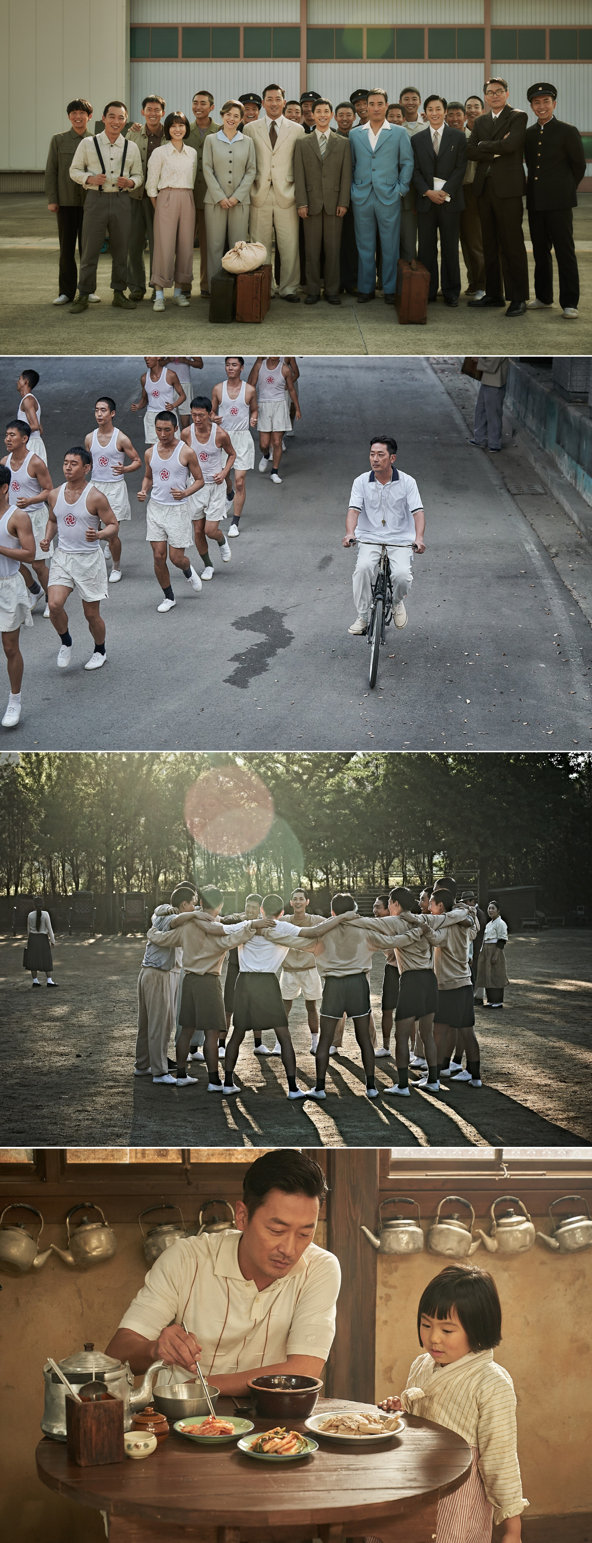 먼저 대한민국 최초의 국가대표팀 손기정(하정우), 서윤복(임시완), 남승룡(배성우)과 이들이 1947년 보스턴 마라톤 대회에 출전하기까지 도움을 준 인물들의 단체 사진이 시선을 사로잡는다.