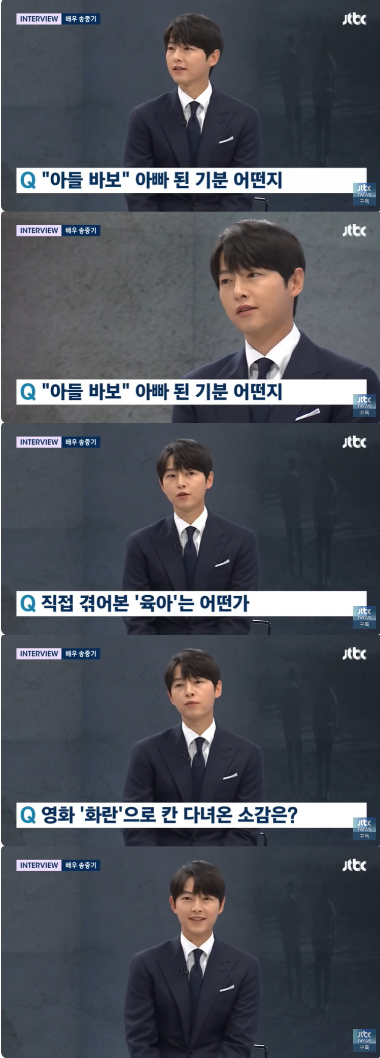 직접 겪어본 육아는 어떨까. 송중기는 "아내하고 씩씩하게 서로 잘 하고 있다는 생각이 든다. 으쌰으쌰 하면서. 굉장히 뿌듯한 일인 거 같다. 그래서 요즘에 굉장히 행복함이 충만하다"고 행복해했다.