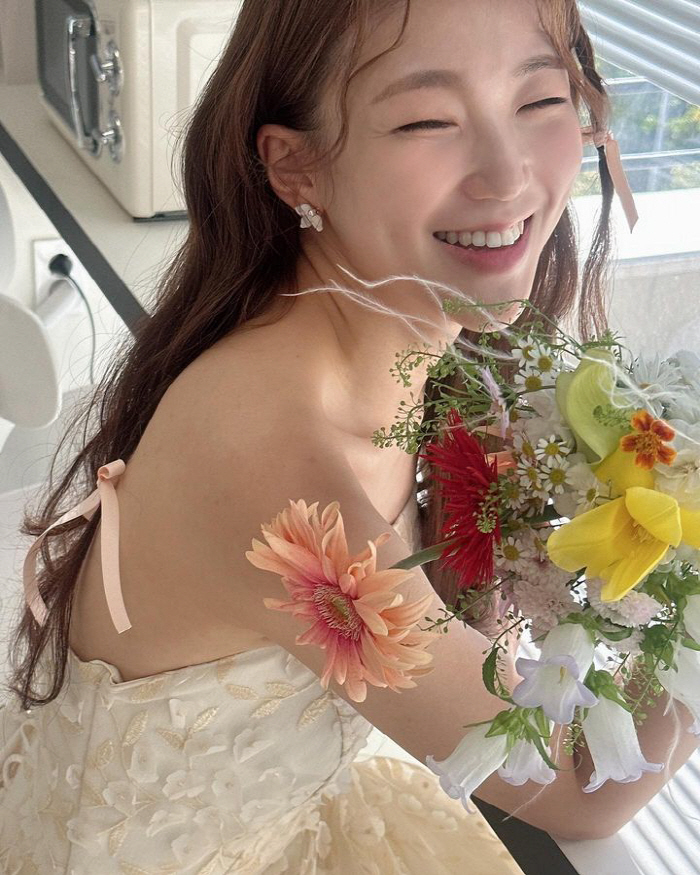 사진 속 순자는 웨딩드레스 같은 오프숄더 화이트 드레스로 미모를 뽐내고 있다. 부케 같은 꽃다발까지 '10월의 신부'를 방불케한다.