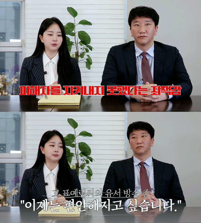 김다예는 "고 표예림님의 사망 소식에 제가 죽은것 같은 고통을 받아서 잠도 못자고 그랬다"며 "피해자를 지키지 못했다는 자책감이 크다"고 말했다.