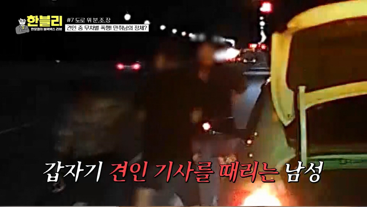 이날 한문철 변호사가 공개한 블랙박스 영상에는 한국도로공사의 '긴급 견인 서비스'에 지정된 업체 소속 견인 기사가 야간 고속도로 사고 현장에 출동한 뒤 한 남성에게 무자비하게 폭행당하는 모습이 담겨있었다. 가해자는 가족들의 만류에도 불구하고 흥분을 억누르지 못하고 급기야 차로로 뛰어들었고, 이후 출동한 경찰의 만류에도 거칠게 저항하다가 결국 수갑까지 채워지며 제지당했다. 알고 보니 가해자는 술에 취한 상태였고, 차들이 쌩쌩 달리는 고속도로에서 벌어진 가해자의 만취 난동에 패널들은 경악을 금치 못했다.