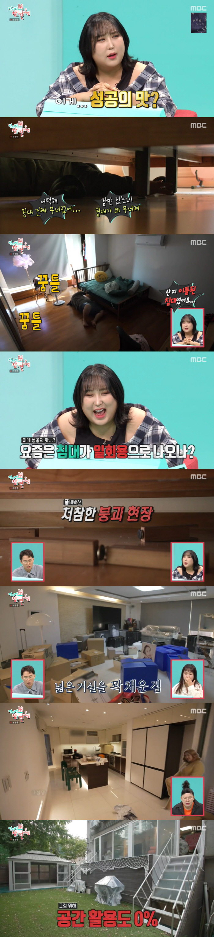 풍자는 "침대 진짜 무너졌다. 잠만 잤는데 침대가 왜 무너지냐"며 침대에 앉았고, 그때 뽀각 소리와 함께 놀란 풍자의 표정이 클로즈업 돼 웃음을 안겼다.