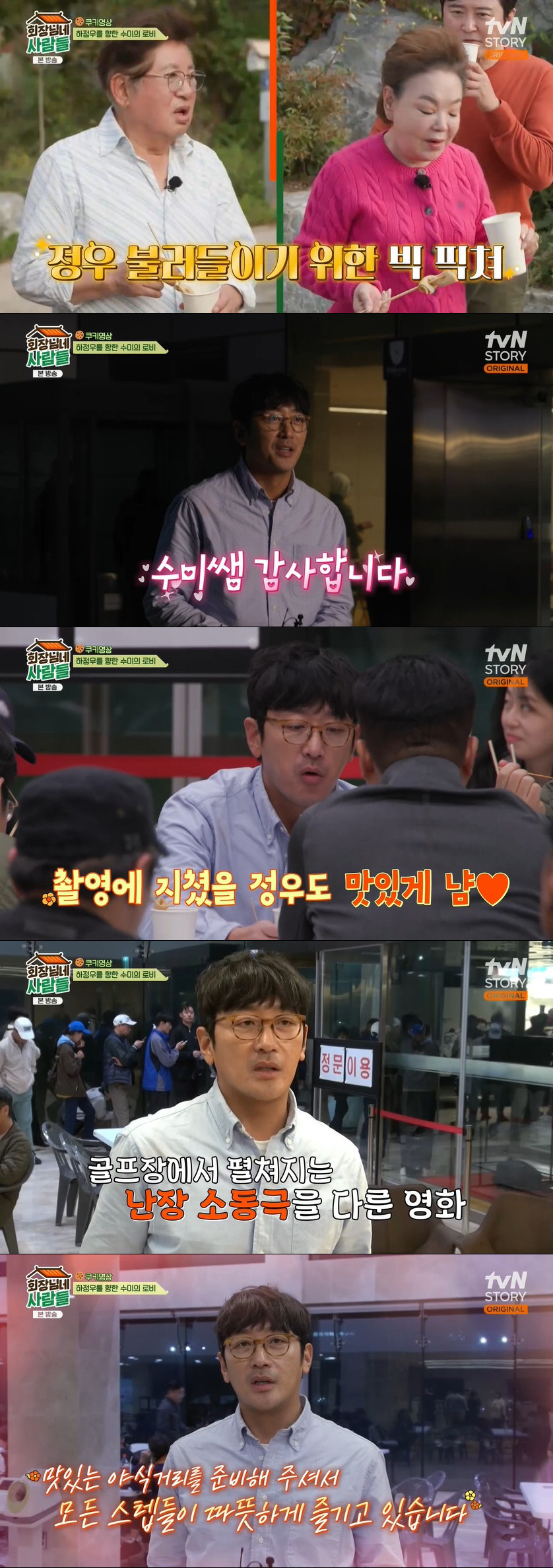 하정우는 "선생님 정말 감사하다. 야식거리를 준비해주셔서 모든 배우와 스태프들이 따뜻하게 즐기고 있다"며 "너무나 감사 드리고 회장님네 사람들 모든 분들 건강하시고 감기 조심하시라. 저도 보답할 기회가 있으면 보답하겠다"고 인사했다.
